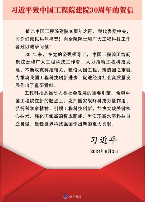 視頻來源:中央廣播電視總臺(tái) 習(xí)近平致信祝賀中國(guó)工程院建院30周年強(qiáng)調(diào) 發(fā)揮國(guó)家戰(zhàn)略科技力量作用 為實(shí)現(xiàn)高水平科技自立自強(qiáng)建設(shè)世界科技強(qiáng)國(guó)作出新的更大貢獻(xiàn) 丁薛祥出席院士座談會(huì)并講話 新華社北京6月3日電 在中國(guó)工程院建院30周年之際,中共中央總書記、國(guó)家主席、中央軍委主席習(xí)近平發(fā)來賀信,代表黨中央致以熱烈祝賀,向全院院士和廣大工程科技工作者致以誠(chéng)摯問候。 習(xí)近平在賀信中指出,30年來,在黨的堅(jiān)強(qiáng)領(lǐng)導(dǎo)下,中國(guó)工程院團(tuán)結(jié)凝聚院士和廣大工程科技工作者,大力推動(dòng)工程科技發(fā)展,不斷攻克科技難關(guān),建設(shè)大國(guó)工程,鑄造國(guó)之重器,為推動(dòng)我國(guó)工程科技創(chuàng)新進(jìn)步、促進(jìn)經(jīng)濟(jì)社會(huì)高質(zhì)量發(fā)展作出了重要貢獻(xiàn)。 習(xí)近平強(qiáng)調(diào),工程科技是推動(dòng)人類社會(huì)發(fā)展的重要引擎。希望中國(guó)工程院在新的起點(diǎn)上,發(fā)揮國(guó)家戰(zhàn)略科技力量作用,弘揚(yáng)科學(xué)家精神,引領(lǐng)工程科技創(chuàng)新,加快突破關(guān)鍵核心技術(shù),強(qiáng)化國(guó)家高端智庫(kù)職能,為實(shí)現(xiàn)高水平科技自立自強(qiáng)、建設(shè)世界科技強(qiáng)國(guó)作出新的更大貢獻(xiàn)。 3日上午,中國(guó)工程院在京舉行“踐行工程科技使命 推進(jìn)科技強(qiáng)國(guó)建設(shè)”院士座談會(huì)。中共中央政治局常委、國(guó)務(wù)院副總理丁薛祥出席會(huì)議,宣讀習(xí)近平賀信并講話。 丁薛祥在講話中指出,中國(guó)工程院成立30年來,堅(jiān)決貫徹黨中央和國(guó)務(wù)院決策部署,大力推動(dòng)工程科技發(fā)展,匯聚一流創(chuàng)新人才、產(chǎn)出一流科技成果、貢獻(xiàn)一流咨詢建議、打造一流學(xué)術(shù)平臺(tái),在國(guó)家發(fā)展進(jìn)步中發(fā)揮了重要作用。 丁薛祥強(qiáng)調(diào),在新時(shí)代新征程上,中國(guó)工程院要牢記建院初心、傳承光榮傳統(tǒng),在學(xué)習(xí)貫徹習(xí)近平總書記重要指示精神、為高水平科技自立自強(qiáng)而奮斗的進(jìn)程中爭(zhēng)當(dāng)排頭兵。要當(dāng)國(guó)家戰(zhàn)略科技力量的排頭兵,牢牢把握新一輪科技革命和產(chǎn)業(yè)變革的戰(zhàn)略機(jī)遇,奮力搶占科技制高點(diǎn)。要當(dāng)工程科技創(chuàng)新的排頭兵,解決好重大工程科技問題,推進(jìn)科技創(chuàng)新成果產(chǎn)業(yè)化應(yīng)用,更好服務(wù)新質(zhì)生產(chǎn)力發(fā)展。要當(dāng)突破關(guān)鍵核心技術(shù)的排頭兵,從國(guó)家急迫需要和長(zhǎng)遠(yuǎn)需求出發(fā),加強(qiáng)“卡脖子”技術(shù)攻關(guān),力爭(zhēng)在重要領(lǐng)域取得更多原創(chuàng)性突破。要當(dāng)國(guó)家高端智庫(kù)建設(shè)的排頭兵,緊緊圍繞具有戰(zhàn)略性方向性全局性的重大問題,加強(qiáng)前瞻性、針對(duì)性、儲(chǔ)備性戰(zhàn)略研究,支撐黨和國(guó)家決策。丁薛祥希望廣大工程院院士帶頭大力弘揚(yáng)科學(xué)家精神,把人生理想融入國(guó)家和民族的事業(yè)中,深懷愛國(guó)之心、秉持報(bào)國(guó)之志、勇攀科技高峰,不負(fù)黨和人民的殷切期望。 座談會(huì)上,中國(guó)工程院負(fù)責(zé)人和院士代表作了發(fā)言。 中國(guó)工程院成立于1994年6月3日。30年來,中國(guó)工程院牢記中國(guó)工程科技界最高學(xué)術(shù)機(jī)構(gòu)職責(zé)使命,聚力科技創(chuàng)新、匯聚領(lǐng)軍人才、建設(shè)高端智庫(kù)、堅(jiān)持學(xué)術(shù)引領(lǐng),取得了一系列重大成果。 |