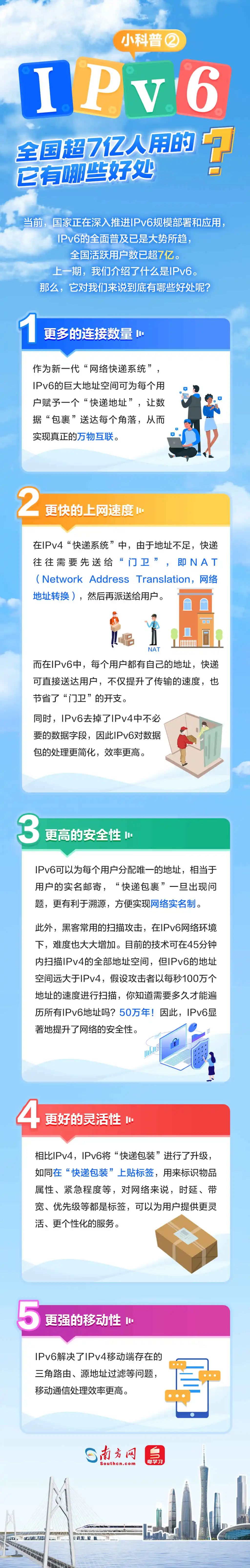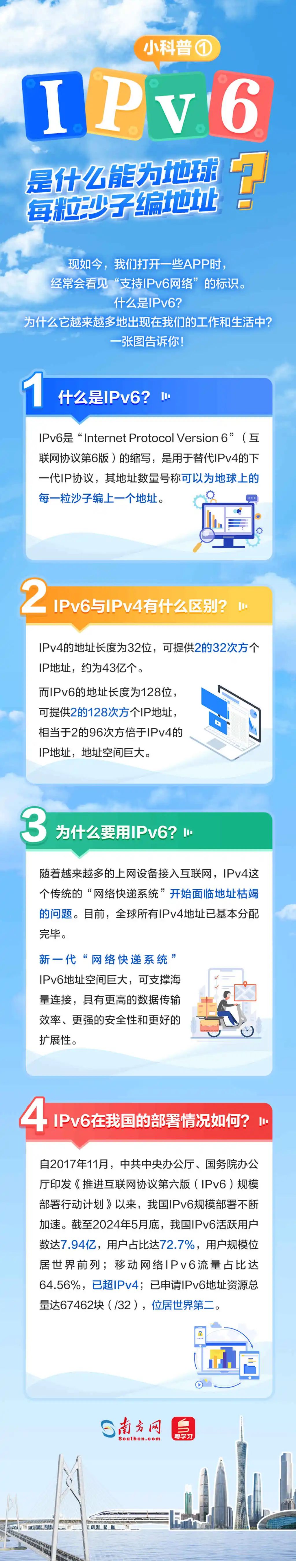 什么是IPv6?它對(duì)我們來說有哪些好處?廣東IPv6部署取得了哪些成效,為哪些行業(yè)帶來了改變?部署IPv6又有哪些關(guān)鍵步驟?5張圖帶你看懂這個(gè)能為地球每粒沙子編地址的神奇技術(shù)!